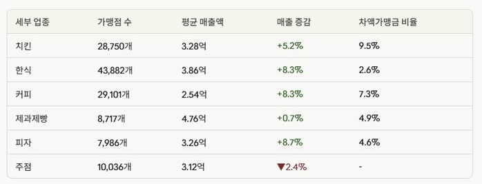 특히 외식업에서는 한식과 커피업종이 시장 회복을 주도했다. 한식 가맹점은 4만3,882개로 전체 외식업의 23.9%를 차지했고, 매출 증가율도 8.3%에 달했다. 피자 업종(8.7%)과 치킨(5.2%)도 매출 개선세를 보였다. 반면 주점업은 2.4% 감소하며 부진을 이어갔다. 고물가 속 소비자들이 ‘가성비 중심 외식’으로 이동하며, 치킨·저가커피 브랜드에 매출이 집중된 결과다.