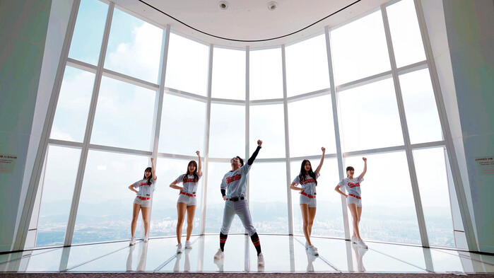 이번 응원 영상을 위해 롯데자이언츠의 조지훈 응원단장과 박기량 치어리더 등 총 5명의 응원단이 롯데월드타워 555m 정상에 올랐다.