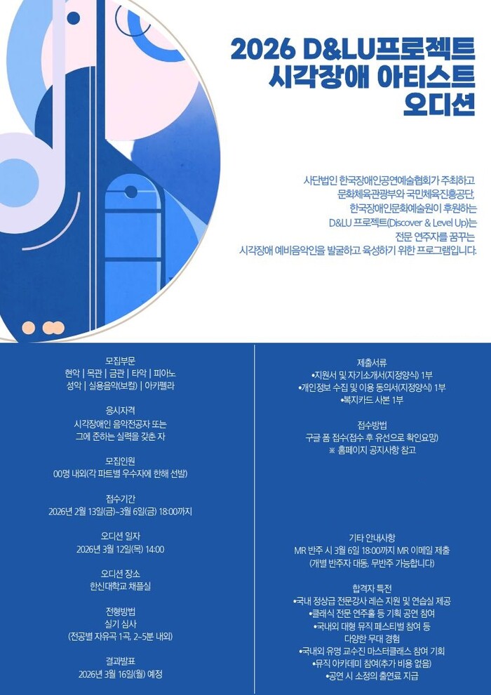 한국장애인공연예술협회, ‘2026 시각 장애인 연주자 양성 D&LU 프로젝트’ 오디션 개최