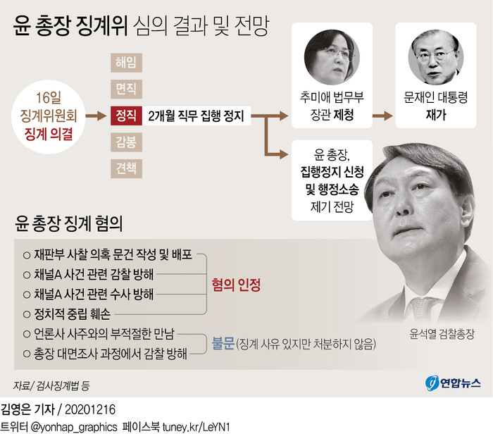 징계위는 15일 오전 10시 34분부터 16일 오전 4시까지 무려 17시간 30분에 걸친 마라톤 회의 끝에 윤 총장에 대한 정직 2개월 처분을 의결했다. 이에 따라 윤 총장은 2개월 간 직무 집행이 정지된다.
