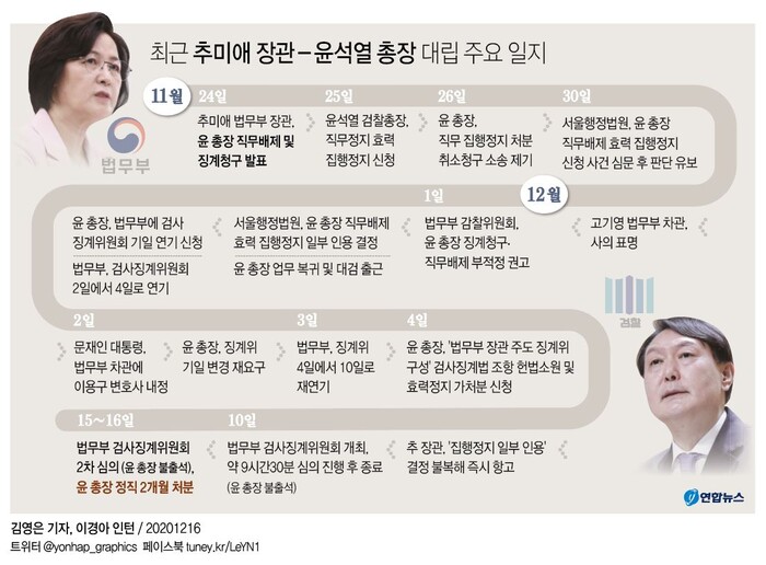 ▲ 최근 추미애 장관-윤석열 총장 대립 주요 일지. [그래픽= 연합뉴스] |