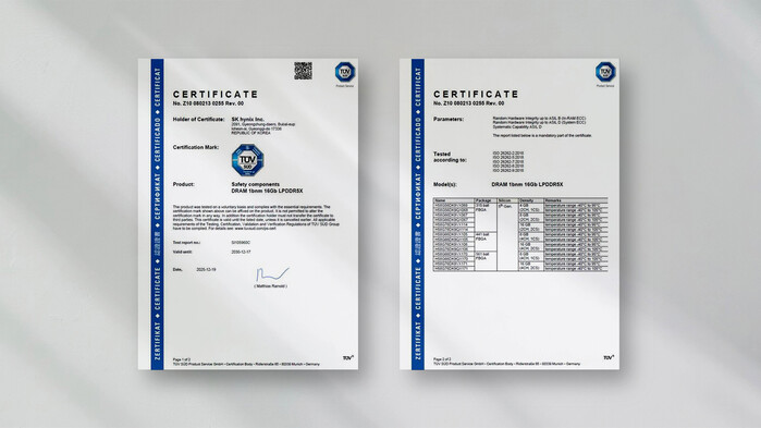 TUV SUD는 이번 심사에서 LPDDR5X 제품의 기능 안전 성능뿐만 아니라 ▲안전 아키텍처 및 설계 개념 ▲오류 예방·탐지·진단 메커니즘 ▲개발 및 검증 프로세스 ▲품질 관리 체계 전반 등을 종합적으로 검증했다. 이를 통해 SK하이닉스의 개발·검증·품질 프로세스가 글로벌 자동차 산업 기준에 부합함을 인정했다.