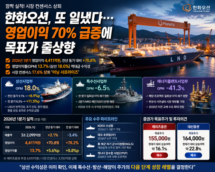 현재 한화오션 주가는 13만3500원 안팎에서 형성돼 있다. 이 기준으로 메리츠증권 목표주가(15만5000원) 대비 상승 여력은 약 16.1%, 대신증권 목표주가(16만4000원) 대비 상승 여력은 약 22.8% 수준으로 평가된다. 증권가에서는 상선부문의 고수익 구조가 이미 자리를 잡았고, 이제부터는 방산·특수선·해양 프로젝트에서의 수주 성과가 주가의 다음 단계 성장 레벨을 결정할 것으로 보고 있다.