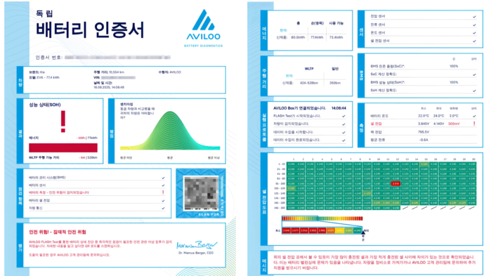 이처럼 국제적인 공신력을 확보한 AVILOO 배터리 테스터는, 사람으로 치면 '정밀 건강검진'과 같다. 배터리에 물리적인 테스트를 진행하여 실제 배터리 잔여 수명(SOH), 주행 가능 거리(WLTP), 셀 전압 편차, 셀 전압 편차실사용 가능 에너지(kWh) 등 핵심 데이터를 객관적인 수치로 측정한다.