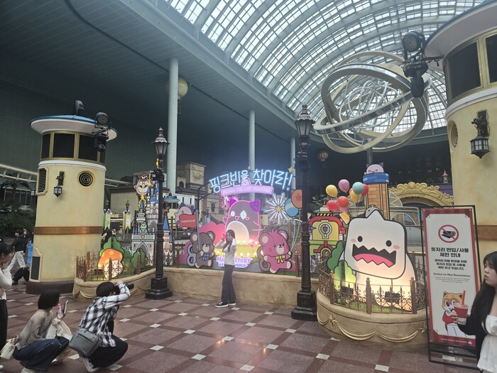 | ▲방문객이 롯데월드 실내에 마련된 '핑크빈을 찾아라' 포토존에서 기념촬영을 하고 있다. [사진=메가경제] |