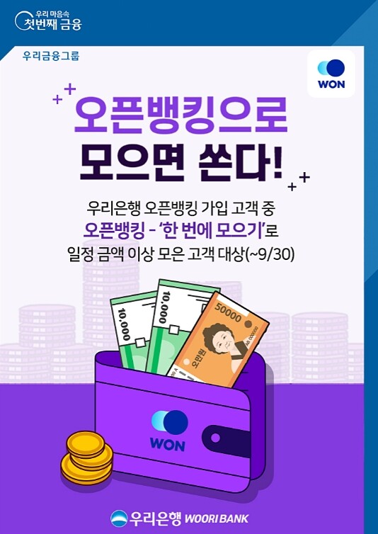 우리은행(은행장 권광석)은 우리WON뱅킹의 오픈뱅킹 서비스 중‘한 번에 모으기’로 일정 금액 이상 모은 고객을 대상으로‘오픈뱅킹으로 모으면 쏜다!’이벤트를 30일까지 실시한다고 9일 밝혔다.