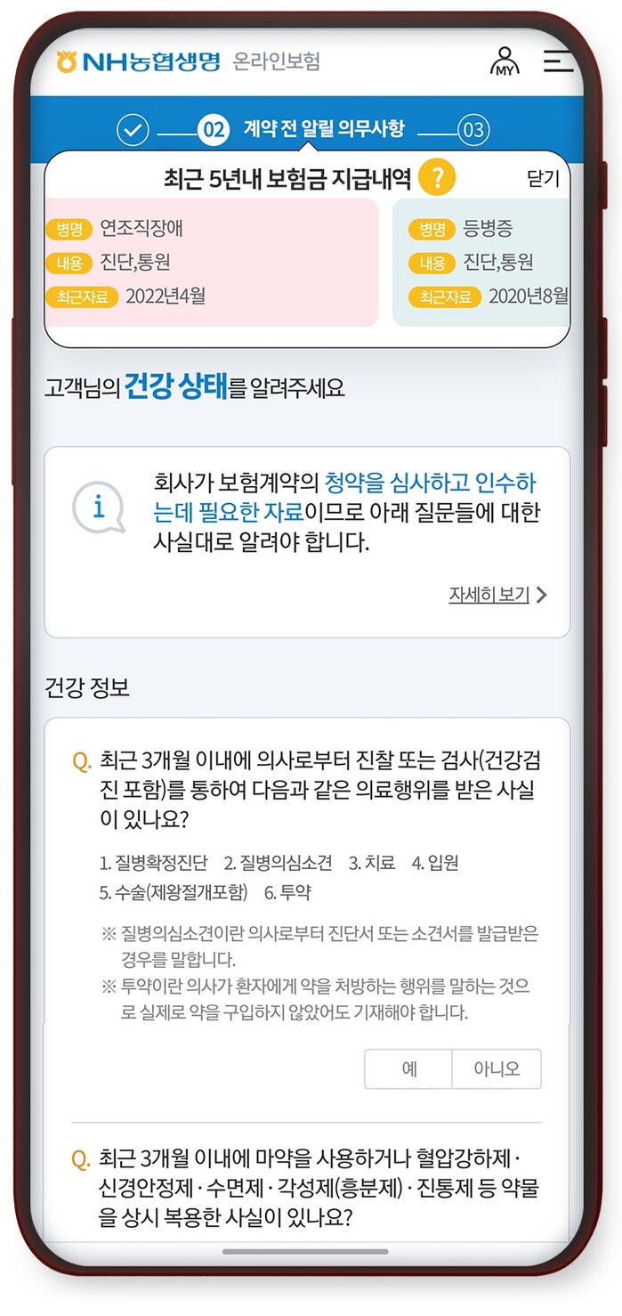 농협생명이 모바일에서 보험금 지급 이력을 사전에 알려주는 신규 서비스를 오픈했다. 국내 전체 보험사의 보험금 지급 이력 정보를 활용해 과거 5년간 주요 치료 내역 확인하여 ‘계약 전 알릴 의무’ 작성에 도움이 될 것으로 보인다