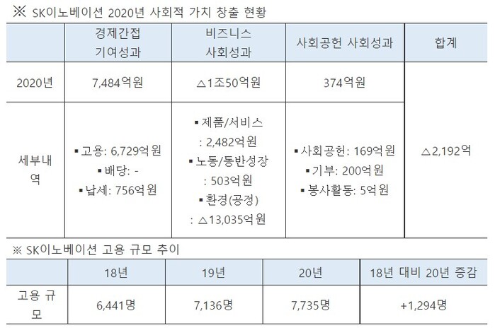 SK이노베이션은 창출한 사회적 가치 총액은 감소했지만 세부항목 중 ▲환경오염배출저감 ▲고용 ▲사회공헌 활동 ▲사회문제 해결을 위한 제품/서비스 성과는 개선됐다고 말한다.