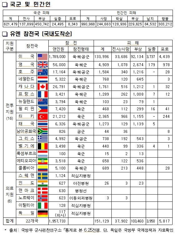 | ▲ 6·25전쟁 참전현황 개요. [국가보훈처 제공] |