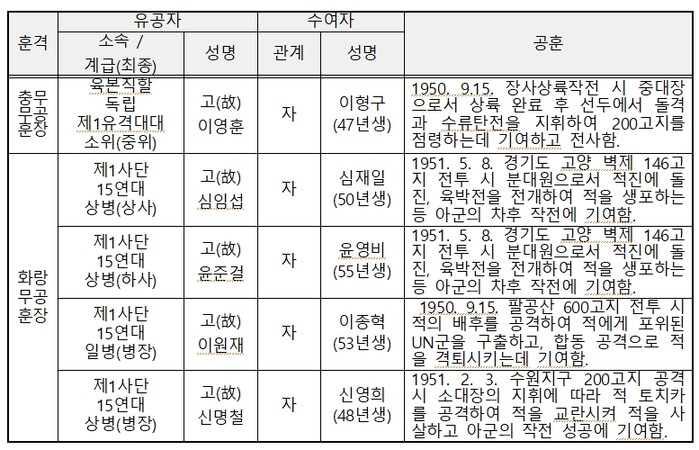충무무공훈장은 고(故) 이영훈 육본직할 독립 제1유격대대 소위(중위)에게. 화랑무공훈장은 고 심임섭 제1사단 15연대 상병(상사), 고 윤준걸 제1사단 15연대 상병(하사), 고 이원재 제1사단 15연대 일병(병장). 고 신명철 제1사단 15연대 상병(병장) 4명에게 각각 추서된다.