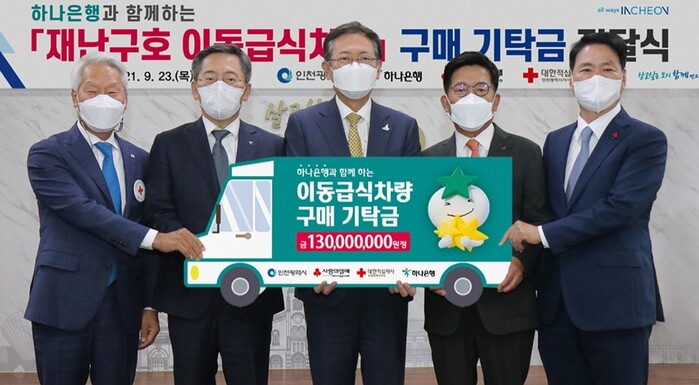 하나은행(은행장 박성호)은 지난 23일 대한적십자사 인천광역시지사(지사회장 김창남)에 재난구호 이동급식차량 구매를 위한 기탁금 1억 3000만원을 전달했다고 밝혔다.