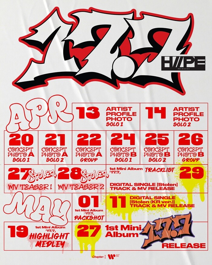 하입프린세스는 10일 공식 SNS를 통해 첫 번째 미니앨범 ‘17.7’의 프로모션 로드맵을 담은 스케줄러 이미지를 선보였다. 데뷔를 향한 콘텐츠 공개 일정이 구체적으로 드러나면서 팀의 출발을 향한 기대감이 더욱 높아지고 있다.