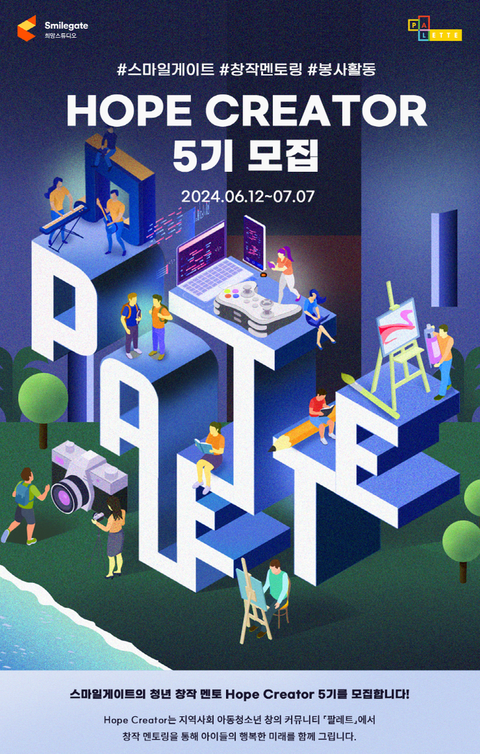 [메가경제=이동훈 기자] 스마일게이트 희망스튜디오(이사장 권혁빈, 이하 ‘희망스튜디오’)는 어제부터 7월 7일까지 ‘팔레트(PALETTE)’ 멘토 ‘호프 크리에이터(Hope Creator)’ 5기를 모집한다고 13일 밝혔다.