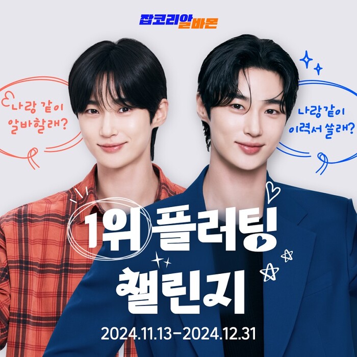 1위 플러팅 챌린지는 잡코리아와 알바몬 회원이면 누구나 참여할 수 있다. 12월 31일까지 잡코리아와 알바몬 앱을 방문해 변우석 플러팅 쇼츠를 감상하고 알바와 직장생활 상황에 맞는 설레거나 유쾌한, 또는 감동적인 플러팅 멘트를 작성하면 된다.