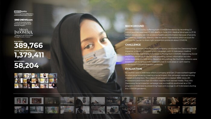 인도네시아 의과대학 재학생 15명으로 구성된 대웅소셜임팩터는 코로나19 관련 정보성 영상 콘텐츠를 제작해 높은 문맹률로 정보 접근성이 낮은 현지 국민에게 올바른 예방 수칙을 확산시켰다.
