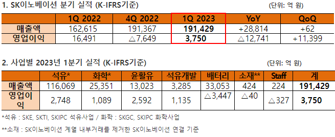 SK이노베이션은 올해 1분기 매출 19조 1429억원, 영업이익 3750억원, 당기순손실 520억원을 기록했다고 4일 밝혔다. 전년 동기에 비해 영업이익은 77.3% 감소했다. 지난해 4분기 영업손실 6833억원 비해서는 흑자로 돌아섰다.