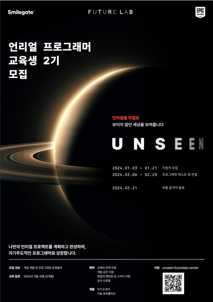 [메가경제=이동훈 기자] 스마일게이트 퓨처랩은 언리얼 엔진 교육 프로그램 ‘언씬(UNSEEN)’ 2기 교육생을 오늘부터 1월 21일까지 모집한다고 밝혔다.