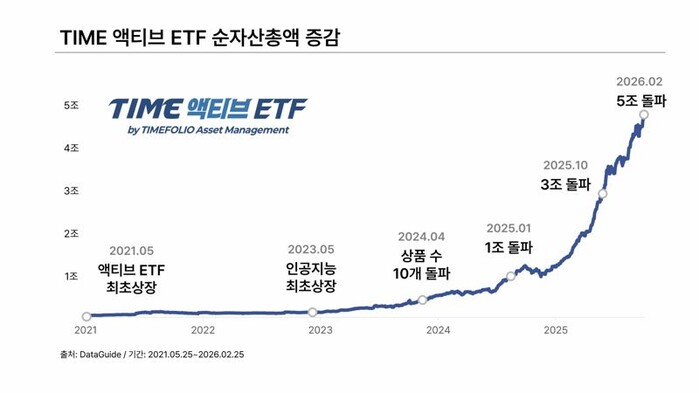 26일 한국거래소에 따르면 타임폴리오자산운용의 ETF 순자산 총액은 5조718억원으로 집계됐다. 지난달 6일 4조 원을 돌파한 후 약 50일 만에 거둔 성과다.