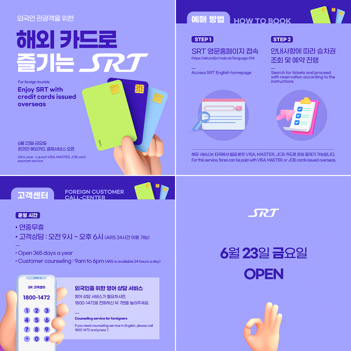 해외카드 온라인 결제 서비스를 이용하면 외국인 고객이 역사 표사는 곳에서만 할 수 있었던 SRT 승차권 결제를 온라인에서도 할 수 있다. 외국인 관광객 국내여행 교통편의 향상을 위해 문화체육관광부와 협력사업을 추진해 23일부터 서비스를 시작했다.
