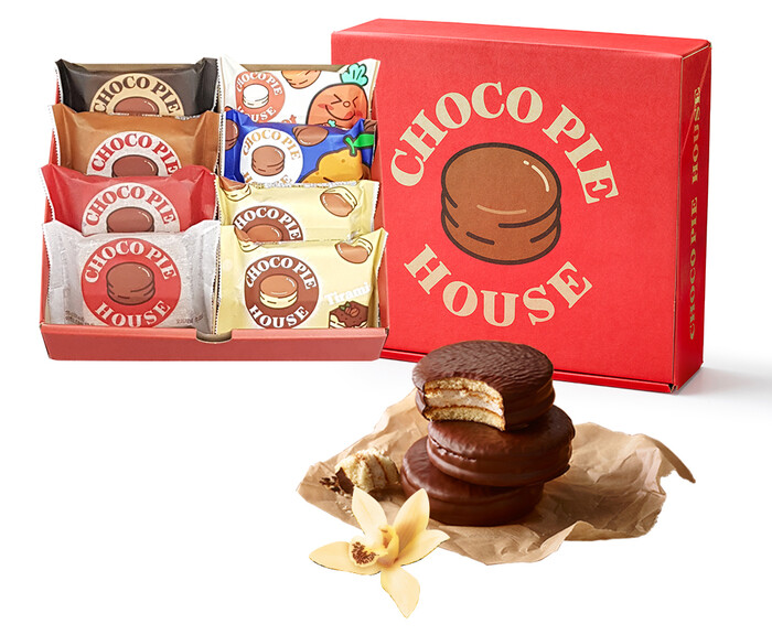 초코파이하우스 선물세트는 디저트 초코파이 오리지널, 레드벨벳, 카라멜솔트, 카카오 등 시그니처 플레이버와 최근 2030세대에게 조명 받는 당근케이크, 티라미수, 제주 한라봉을 한 상자에 담은 제품이다.