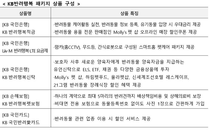한편 KB국민은행은 패키지 상품 출시를 기념해 KB반려행복적금, Liiv M 반려행복 LTE요금제, KB반려행복신탁 가입고객을 대상으로 다양한 경품 이벤트를 진행한다.