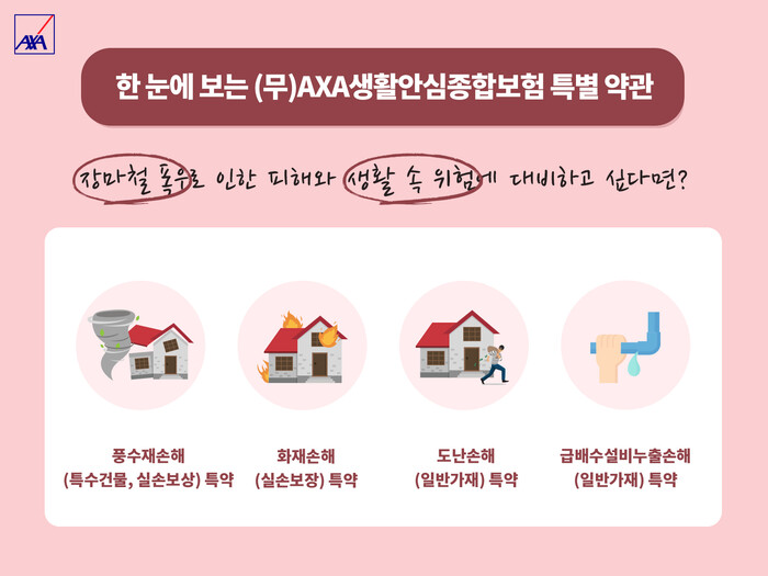 ▲AXA손해보험이 장마철 폭우 피해에 미리 대비할 수 있는 (무)AXA생활안심종합보험 가입을 제안했다. [사진=AXA손해보험] |