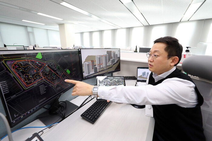 ▲ 대우건설 직원이 4D 스마트모델링 프로그램을 시연하고 있다. [사진=대우건설 제공] |