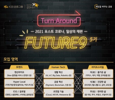 | ▲ KB국민카드(사장 이동철)가 트렌드, 휴먼테크(Human-tech), 라이프스타일 등 9개 영역에서 스타트업 엑셀러레이팅 프로그램 ‘퓨처나인(FUTURE9)’ 5기 참가 업체를 모집한다. [그래픽=국민카드 제공] |