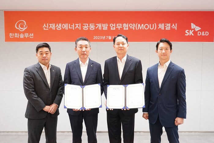 한화솔루션은 지난 11일 서울 장교동 한화빌딩에서 SK디앤디와 수소연료전지 및 태양광 발전 사업 추진을 위한 전략적 업무협약(MOU)을 체결했다고 12일 밝혔다. 체결식에는 기일 한화솔루션 인사이트 부문 에너지솔루션사업부장과 김해중 SK디앤디 에너지솔루션본부장 등이 참석했다.