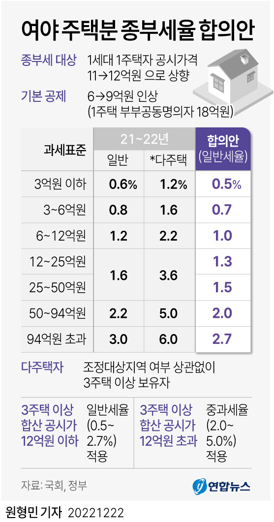 전날 여야 합의에 따라 종합부동산세 기본공제는 기존 6억원에서 9억원으로 올라가고, 조정지역에 2주택을 보유한 사람도 중과세율이 아닌 일반세율로 종부세를 내게 된다.