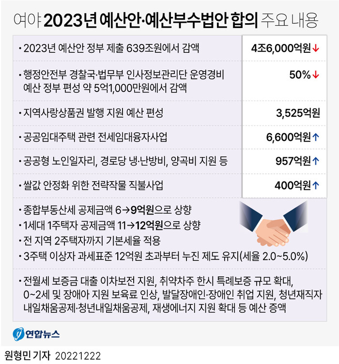 | ▲ 여야는 22일 내년도 예산안과 예산부수법안 등 쟁점 현안에 대해 일괄 합의했다. [그래픽=연합뉴스] |