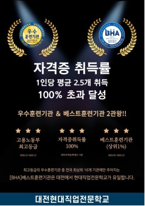 한편, 대전 현대직업전문학교는 2024년 고용노동부 직업능력심사평가원 주관 훈련이수자 평가에서 A등급을 획득했으며, 올해는 ‘베스트직업훈련기관(BHA)’에 선정되며 명실상부한 직업능력개발 분야의 선도기관으로 자리잡고 있다.