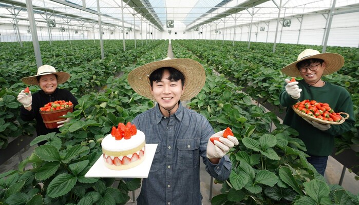 | ▲ 충청남도 논산시에 위치한 비타베리 재배 농가에서 청년농부들이 비타베리와 비타베리를 활용한 파리바게뜨 케이크를 들고 있다 [사진=SPC 제공] |