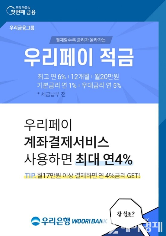우리금융지주의 자회사 우리은행(은행장 권광석)은 우리은행 거래실적과 우리페이 계좌결제서비스 이용실적에 따라 최고 연 6.0%의 고금리를 제공하는 ‘우리페이 적금’을 출시했다고 24일 밝혔다.