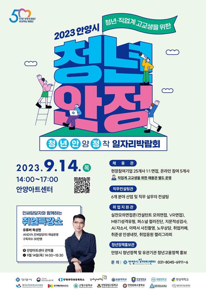 [메가경제=장준형 기자] 안양시는 시 승격 50주년을 맞아 청년·직업계 고교생을 위한 '청년 안양정착 일자리 박람회'를 14일 오후 2시 안양아트센터에서 개최한다고 13일 밝혔다.