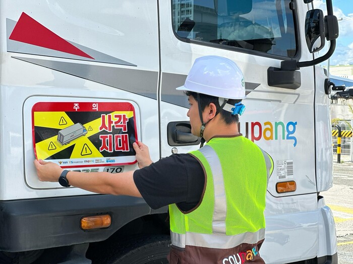 30일 쿠팡에 따르면 이번 캠페인은 한국교통안전공단(TS), 경찰청과 합심해 기획됐다. 대형 화물차 조수석 측면에 ‘사각지대 주의’ 알림 표지를 부착해 주변 운전자와 보행자 등에게 시각적 환기 및 주의 효과를 주기 위함이다.