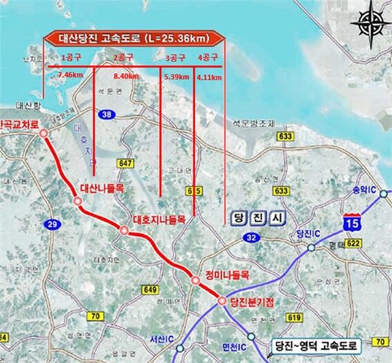 '대산당진 고속도로'는 대산 석유화학단지와 서해안고속도로 당진 분기점을 연결하는 총 길이 25.36km의 고속도로다. ‘대산당진 고속도로’가 완공되면 날로 증가하는 대산항 물동량을 원활하게 처리할 수 있을 것으로 기대된다. 고속도로 개통은 2030년으로 예정돼 있다.