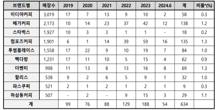 최근 6년간(2019년~2024년 6월 말 기준) 브랜드별 매장 수 대비 평균 위반건수 비율을 분석한 결과, 컴포즈커피·더벤티(1.3%), 메가커피(1.2%), 하삼동커피(1.1%), 투썸플레이스·할리스(1.0%) 순으로 높았으며, 스타벅스(0.2%), 이디야커피·파스쿠찌(0.3%) 순으로 낮았다.