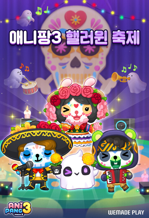 핼러윈 유령들의 콘서트를 주제로 신규 콘텐츠와 이벤트를 준비한 ‘애니팡3’는 핼러윈 축제로 유명한 멕시코 명소들을 배경으로 새벽녘 거리, 공동묘지 등을 배경으로 신규 에피소드의 퍼즐 스테이지를 선보인다.