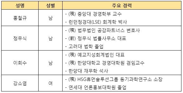 지난 8일 공시에 따르면, 홍철규 중앙대 교수(회계학 박사), 정무식 변호사, 이희수 회계법인 예교지성 대표(재무 경영진단 분야), 강소엽 HSG 휴먼솔루션그룹 동기과학연구소 소장 등이 사외이사 후보로 확정했다.