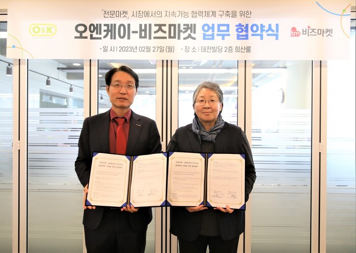 지난 27일 오엔케이 사옥에서 진행된 이번 협약식은 강오순 오엔케이 대표, 허탁 비즈마켓 대표 등이 참석해 전문마켓 시장에서의 지속가능한 협력 체계를 구축하고 사업을 추진하기로 뜻을 모았다.