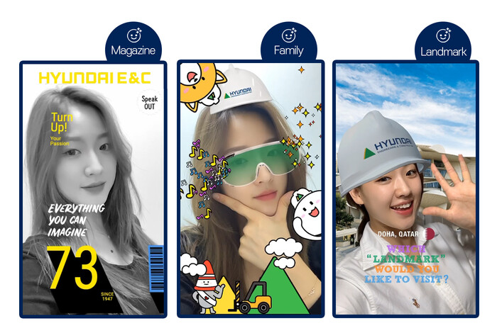 인스타그램 스토리 카메라 촬영 시 얼굴을 인식해 그래픽을 더하는 ‘인스타그램 AR필터’는 ▲현대건설 글로벌 랜드마크 투어 편 ▲현대건설 상상랜드 패밀리 편 ▲현대건설 매거진 표지모델 편 등 3종으로 제작돼 다양한 세대가 현대건설의 상상력에 동참하는 주인공이 될 수 있도록 했다.