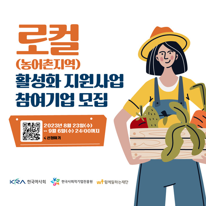 [메가경제=정진성 기자] 한국마사회(회장 정기환)는 함께일하는재단(이사장 이세중), 한국사회적기업진흥원(원장 정현곤)과 함께 '2023년도 로컬(농어촌지역) 활성화 지원사업'(이하 지원사업)에 참여할 사회적경제기업을 이달 23일부터 9월 6일까지 모집한다고 25일 밝혔다.