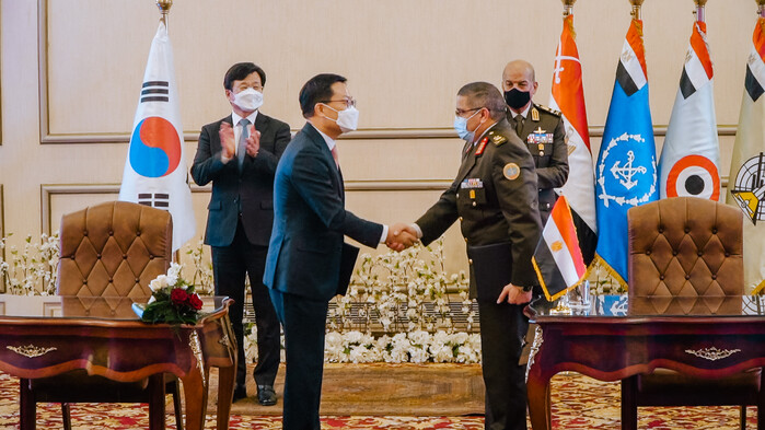 | ▲ 손재일 한화디펜스 대표이사(왼쪽)와 오사마 에자트 이집트 국방부 전력국장이 수출계약 체결식에 참석한 모습 [사진=한화디펜스 제공] |