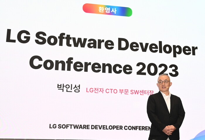 ▲ 14일부터 이틀간 마곡 LG사이언스파크에서 LG 소프트웨어 개발자 콘퍼런스가 열리는 가운데, LG전자 CTO부문 SW센터장 박인성 전무가 개막을 알리는 환영사를 하고 있다. [사진=LG전자] |