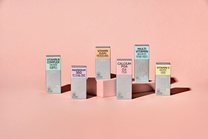 브이푸드 6종의 정제는 최대 1.4cm 크기로 목 넘김이 불편한 고객도 쉽게 섭취할 수 있다. 상대적으로 고객 수요가 많은 비타민C, B군, D3는 DSM 社의 프리미엄 비타민 원료를 사용해 경쟁력을 높였다.