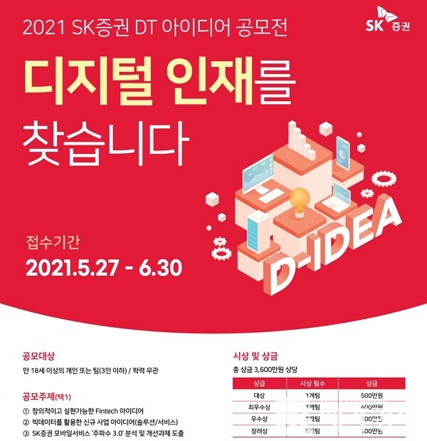 SK증권 (사장 김신)은 ‘2021 SK증권 DT(Digital Transformation) 아이디어 공모전’을 개최한다고 27일 밝혔다.