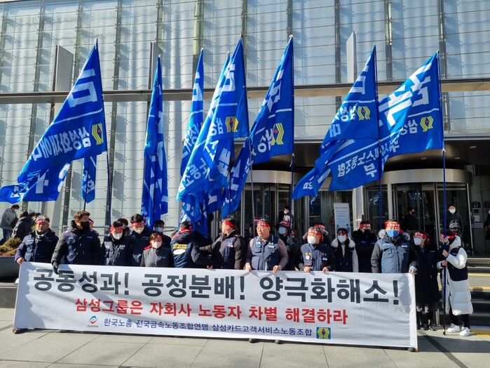 ▲ 삼성카드고객서비스노조는 지난 18일 오후 1시 삼성본관빌딩 앞에서 "삼성카드 자회사 차별철폐 집회 및 기자회견"을 개최했다.[사진=삼성카드고객서비스노조 제공] |