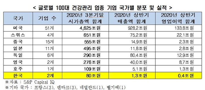 2020년 3분기 말 글로벌 헬스케어 업종 시가총액 상위 100대 기업(S&P 캐피탈 IQ 기준) 중에서 한국 기업은 삼성바이오로직스(51위), 셀트리온(65위) 등 2개사 뿐이었다.