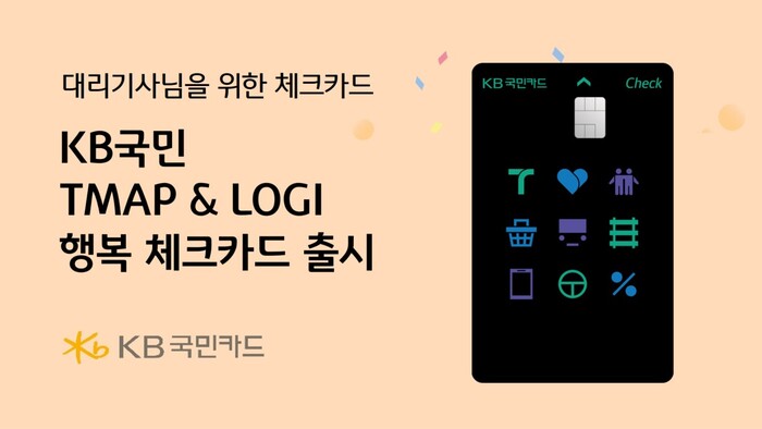 KB국민카드는 이번 신상품 출시를 기념해 오는 9월20일까지 TMAP과 LOGI 대리기사를 대상으로 다양한 이벤트를 진행한다. KB국민 TMAP & LOGI 행복 체크카드 신규 발급시 1만원 캐시백이나 TMAP 대리기사 앱포인트를 지급한다.